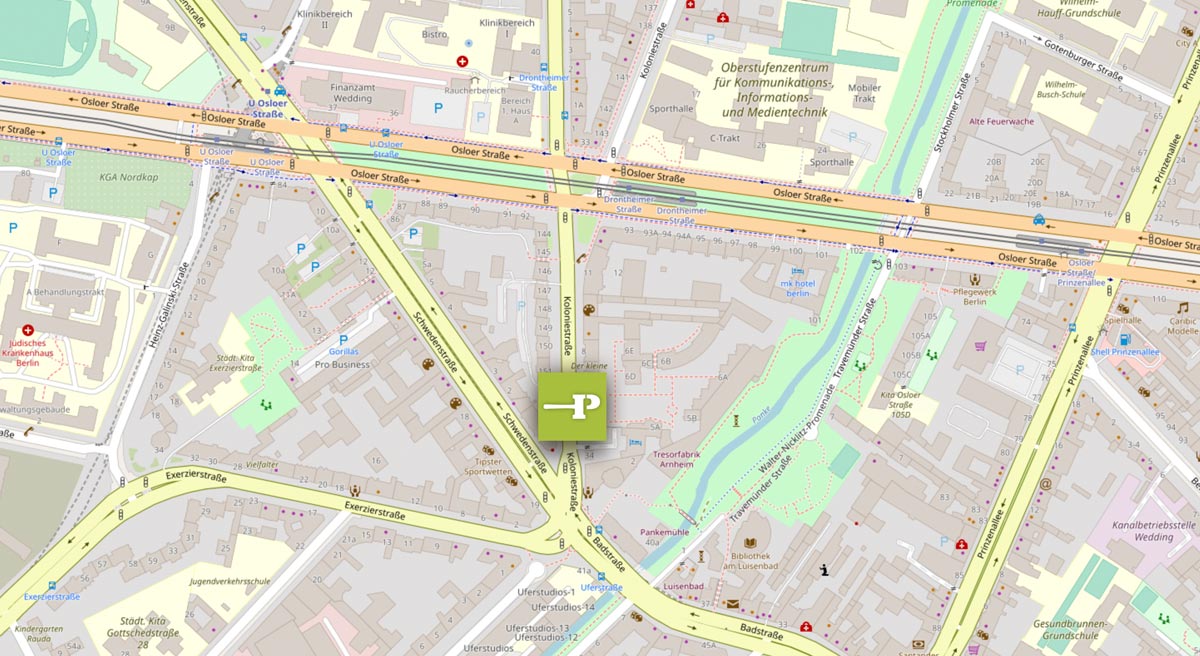 Öffentlicher Parkplatz hinter dem Gebäude. Anfahrt Planen »